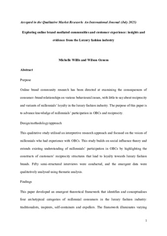 Ozuem, Wilson and Willis, Michelle (2025) Exploring online brand mediated communities and customer experience: insights and evidence from the Luxury fashion industry. Qualitative Market Research: An International Journal. ISSN 1352-2752