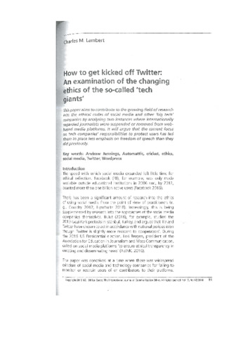 Lambert, Charles M (2018) How to get kicked off Twitter: An examination of the changing ethics of the so-called 'tech giants'. The International Journal of Communication Ethics, 15 (1/2). pp. 81-91. ISSN 1742-0105